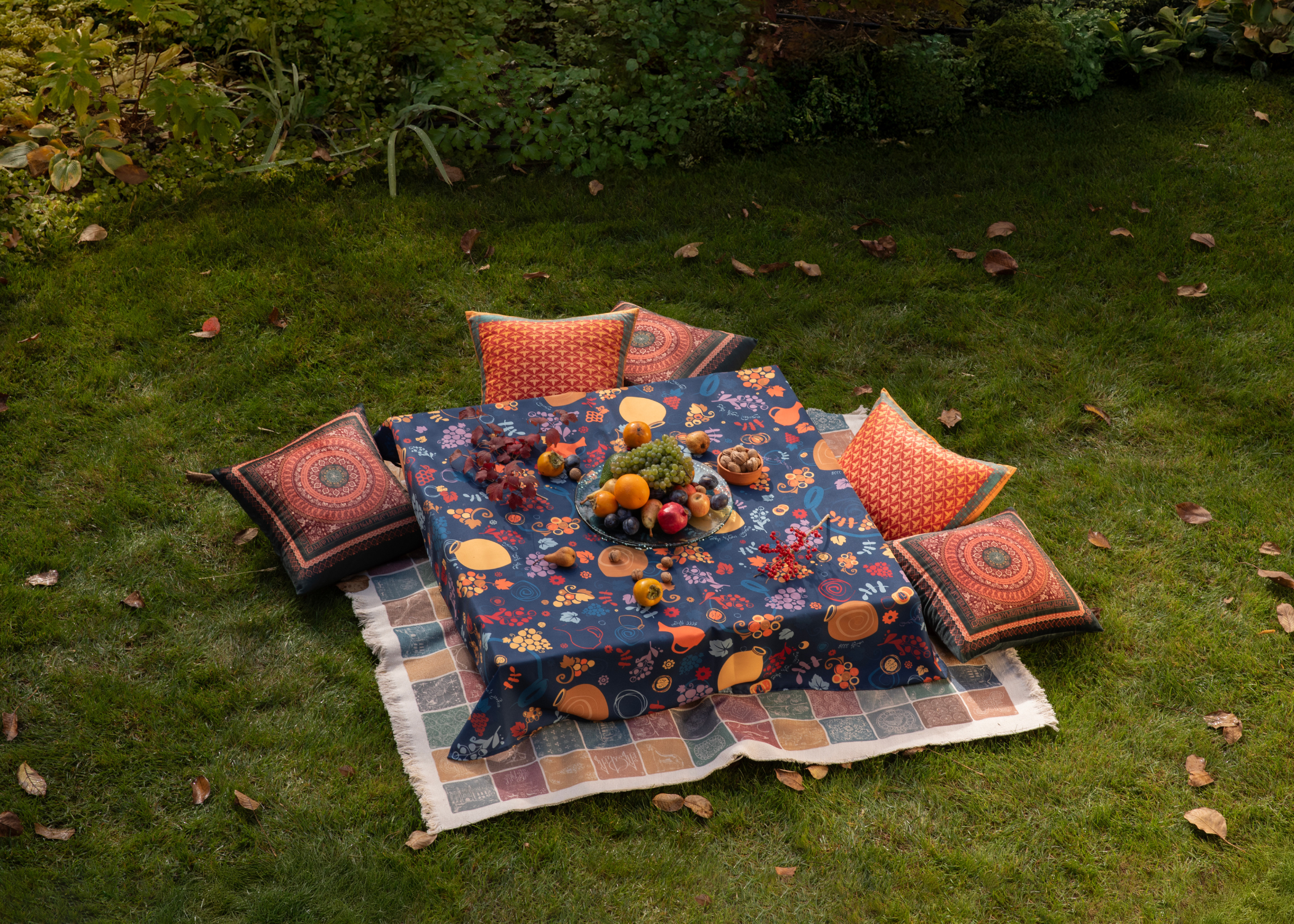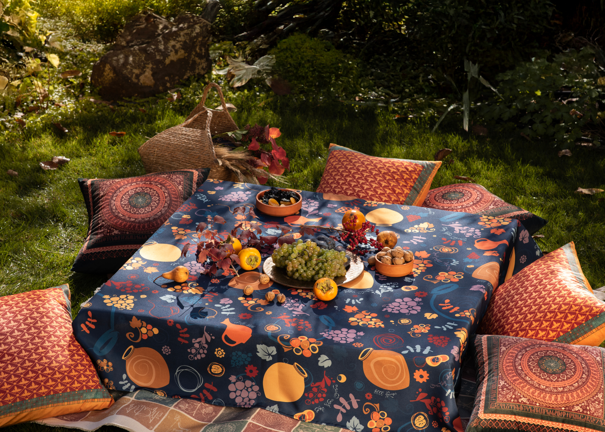 სუფრა - ქვევრები - ლურჯი, ზომა: 140 x 140 სმ, აირჩიეთ მასალა: პოლიესტერი